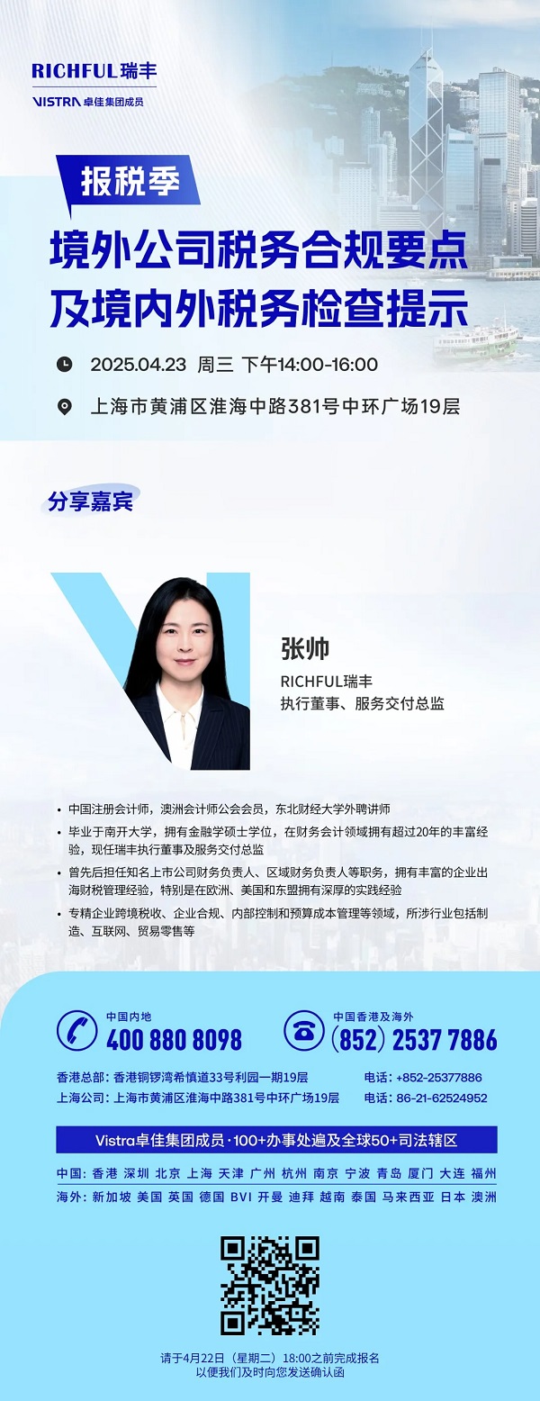 為幫助您更深入理解境外公司稅務(wù)合規(guī)要點,精準(zhǔn)把握境內(nèi)外稅務(wù)檢查關(guān)鍵,我們誠摯邀請您參與以下專業(yè)活動。在活動中,您將獲得行業(yè)前沿的稅務(wù)知識與實操技巧,助力企業(yè)從容應(yīng)對復(fù)雜多變的稅務(wù)環(huán)境。