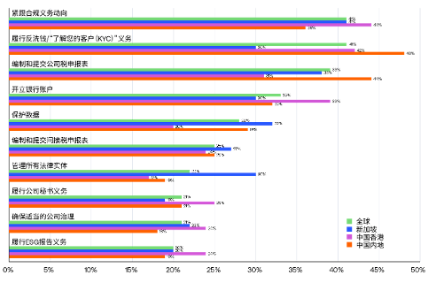 研究顯示,不同國家或地區以及不同行業在合規方面所面臨的挑戰存在顯著差異。中國香港和新加坡的公司在緊跟法規變化方面最為吃力,銀行、投資管理公司和企業服務提供商也面臨類似問題。中國內地企業最擔心的是如何履行反洗錢和“了解你的客戶(KYC)”義務,而家族辦公室和咨詢公司則在保護數據方面面臨嚴峻挑戰。